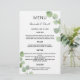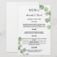 Personalize e adicione seus nomes, data e menu de casamento. Fundo branco, decorado com eucalipto verde, galhos. Fundo branco.