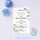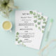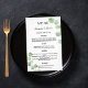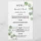 Por favor, note que este menu está no papel folheto e muito fino. Para menus mais espessos (mesmo design) visite nossa loja. Personalize e adicione seus nomes, data e menu de casamento. Fundo branco, decorado com eucalipto verde, galhos. Fundo verde.