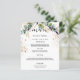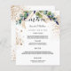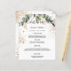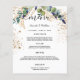 Um elegante, moderno e cardápio de casamento. Um fundo branco decorado com verde de eucalipto e folhas de ouro. Pontos de brilho falsos do ouro. Personalize e adicione seus nomes, data e menu de casamento. Letras pretas coloridas. A palavra Menu é escrita com um script de estilo alfanumérico com letra de tendência com alternâncias. Traseira: fundo branco e queda de brilho de ouro. Cartões de mesa e cartões de lugar correspondentes estão disponíveis em nossa loja.