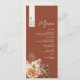 Traga aconchegante elegância para a sua mesa de casamento com este cardápio personalizado de casamento de terracota com o nome de cada convidado em uma faixa vertical de creme. O rico fundo de ferrugem define o tom para uma celebração do outono, enquanto o pincel suave, o pêssego e os florais de marfim com folhagem seca adicionam romance rústico. Um layout limpo com um script elegante e fontes serif faz com que este menu seja ideal para casamentos boho, terra ou ao ar livre. Totalmente personalizável com seus detalhes de refeições e lista de convidados, é uma definição de na moda e uma manutenção significativa.
