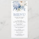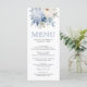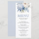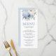 Elegante cardápio de casamento azul empoeirado com lindas flores.