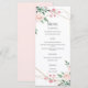 Um cardápio de casamento maravilhosamente personalizável, branco puro, elegantemente adorado com delicados buquês florais cor-de-rosa. A design é aprimorada por linhas geométricas falsas em ouro, acrescentando um toque de sofisticação moderna que complementa perfeitamente o tema romântico de seu dia especial.