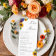 Design apresenta girassóis, rosas e flores silvestres elegantes com uma paleta de cor amarela, burgundy e azul ouro. Você pode alterar a cor de fundo na parte frontal e na parte traseira para a cor de sua escolha ou deixar ambas definidas como brancas.
