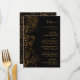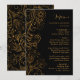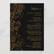 Este elegante cardápio de casamento apresenta um delicado design floral ornamental com flores, pássaros e folhas sobre fundo preto e ouro. O texto combina o script manuscrito e as fontes serif para uma aparência na moda e moderna.
