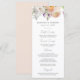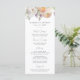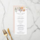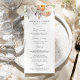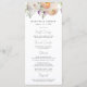 Menu de casamento floral elegante com um buquê de flores em aquarela e folhagens em tons de pêssego, marfim, laranja, rosa claro, roxo, amarelo e verde. Personalize os menus de casamento floral de primavera com seus nomes, data de casamento e detalhes do menu. O menu de casamento floral é perfeito para casamentos de jardim na primavera e verão.