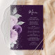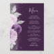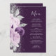 Este elegante cardápio moderno de casamento apresenta um design floral roxo e lavanda, aparado com falso brilho prateado. O texto personalizável combina o script de escrita manual e o tipo de letra da placa em cinza prateada num fundo roxo profundo. O verso repete o design floral.