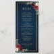 Menu de casamento floral azul-escuro, arrojado, geométrico, com buquê elegante de azul-marinho, azul-real, branco, esbranquiçado, lenhoso, rosa de marsala e folhas verdes de eucalipto sage e elegante quadro neutro geométrico de brilho dourado. Entre em contato comigo para obter ajuda sobre a personalização ou se você precisar de outro produto com este design.