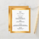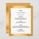Um cartão de cardápio elegante e glamouroso. Modelos para seus nomes, data e menu de casamento. Um quadro fino de ouro e branco e uma cor chic, glamourosa e falsa de ouro metálico com aparência brilhante. Letras pretas coloridas. Fundo: fundo metálico dourado falho.