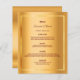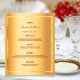 Um cartão de cardápio de casamento elegante e glamouroso. Modelos para seus nomes, data e menu de casamento. Uma falso estrutura dourada e um fundo metálico chic, falso glamouroso e dourado. Letras coloridas brilhantes. Fundo: fundo metálico dourado falho.
