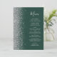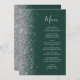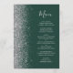 A borda esquerda deste elegante cardápio moderno de casamento apresenta uma falsa borda cintilante prateada. O texto personalizável combina o script de escrita manual imétrica de cinzas prateadas e fontes em um fundo verde esmeralda escuro. O verso apresenta um design verde e cintilante prateado.