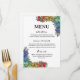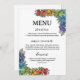 O colorido menu de casamento LGBTQ floral com flores coloridas arco-íris nos cantos, inspirado pela bandeira do orgulho. Adicione o menu de casamento a este cartão de casamento lésbico com flores bonito nas cores da bandeira do orgulho. Cardápio de casamento gay colorido com fontes encantadoras e flores em cores do arco-íris.