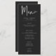 Este design de cardápio de casamento apresenta um tema escuro e humorístico que é simples, mas atordoante. Um fundo negro de carvão negro é a canvas perfeita para o texto da sua refeição de casamento. A parte de trás apresenta os nomes dos casais e a data do casamento. Único e elegante, este design pode ser usado em qualquer estação. Criado pela imprensa simplesmente de farmácia.