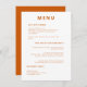 Um cartão de cardápio de casamento único com um toque moderno. Imagem limpa e contemporânea e esquema de cor Burnt Orange and White - nomes e data de casamento no verso. Use-o para sua recepção de casamento ou janto de ensaio. Todos os elementos de texto e cores podem ser personalizados para ajustado de sua necessidade e tema do casamento.