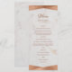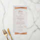 Um cardápio de casamento para um casamento muito moderno combina várias tendências atuais de casamento: metálico, mármore, geométrico e fontes especiais. O fundo é mármore branco. As bordas oblíquas, formando ângulos, são de cobre metálico falso. O título Menu, os nomes da Noiva e do Noivo e a Data do casamento são escritos em uma fonte caligráfica. Todo o texto pode ser personalizado e tem a cor marrom-avermelhada do cobre. Ambas as texturas de mármore e cobre são de Public Domain Pictures.