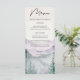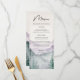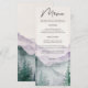 Apresente a refeição do seu casamento com estilo com este menu elegante e inspirado na natureza. O belo design em aquarela apresenta uma paisagem de montanha e floresta nebulosa, criando um cenário sofisticado para suas seleções culinárias. Personalize facilmente o menu com os pratos escolhidos. Um complemento perfeito para o tema de casamento rústico ou ao ar livre.
