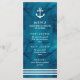 Este menu de casamento estilo náutico apresenta um fundo azul-aquarela de tendência e listras brancas com uma âncora branca correspondente.