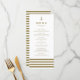 Cartão de menu moderno e clássico perfeito para casamentos de temas náuticos e outros eventos. Apresenta uma ilustração dourada, tipografia clássica e padrão de listras. Os textos são perfeitamente editáveis. Personalize adicionando nomes, data, hora e outros detalhes do menu.
