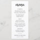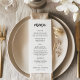Este cartão de menu moderno faz uma declaração com seu roteiro em negrito e esquema de cores preto e branco. A fonte de estilo manuscrito adiciona um toque de personalidade, enquanto o layout claro garante que seus hóspedes possam utilizar facilmente os cursos deliciosos que você escolheu para sua celebração de casamento.