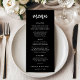 Este cartão de menu moderno faz uma declaração com seu roteiro em negrito e esquema de cores preto e branco. A fonte de estilo manuscrito adiciona um toque de personalidade, enquanto o layout claro garante que seus hóspedes possam utilizar facilmente os cursos deliciosos que você escolheu para sua celebração de casamento.