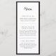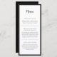O moderno Elegance Black and White Wedding Menu apresenta os nomes dos casais em bela caligrafia e a data em uma fonte serif tradicional de um lado. O verso apresenta o menu de recepção, cercado por uma borda negra mínima. Personalize com suas descrições de menu de recepção de casamento para tentar seus convidados com a refeição que virá. Este design está disponível em vários formatos e nos produtos de eventos de casamento que o acompanham.