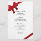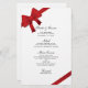 Personalize o menu de Casamentos no inverno vermelhos festivos com os detalhes da refeição que você servirá no almoço de chá de panela de dezembro, janto de recepção de casamentos ou poste o brunch de casamento adicionando a salada ou o primeiro curso, a entrada ou o segundo curso e a sobremesa ou o terceiro curso. Personalize-o com os nomes da noiva e do noivo, localização do local e data do evento. Este elegante cardápio de casamento do inverno personalizado apresenta um design arco vermelho e branco adorando os cantos que se parecem com um presente de Natal embrulhado.