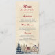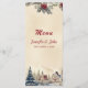 Prepare-se para saborear sabores de inverno! Nosso cartão de cardápio mostra uma cena de neve com bagas sagradas, um pinheiro com neves e uma charmosa vila de inverno. É o guia perfeito para os prazeres culinários que esperam. Pegue seus cartões de cardápio de casamento agora e deixe as vibrações da vila de inverno guiarem o paladar de seu convidado em uma jornada deliciosa! Você pode adicionar facilmente o(s) seu(s) nome(s) personalizado(s) e a data do casamento clicando no botão "personalizar".