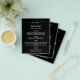 Por favor, note que este menu está no papel folheto e muito fino. Para menus mais espessos (mesmo design) visite nossa loja. Um clássico cardápio de casamento. Um fundo negro. Texto branco. Personalize e adicione seu nome, data e menu. Você pode adicionar mais texto, fotos no verso.