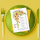 Este elegante cartão de cardápio de casamento foi projetado para complementar seu dia especial com seu quadro de arco cativante adorado com girassóis amarelos vibrantes, bagas e folhas de cor de outono na parte superior esquerda. As iniciais do casal são mostradas elegantemente na tipografia de script, adicionando um toque pessoal ao seu menu de casamento. A parte de trás do cartão é uma cor amarela sólida, alegria radiante e felicidade.