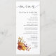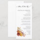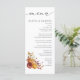 Possui design floral de canto em tons roxos, laranja e amarelos, cor rústica e quente, refletindo a beleza da folhagem de outono. A tipografia de script adiciona um toque de encanto clássico. O menu inclui um início, um curso delicioso principal, uma sobremesa deliciosa e uma seleção de bebidas refrescantes.
