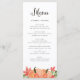 Adicione um sotaque de queda festivo à sua capa de mesa de evento com este cartão de menu personalizável. Apresenta abóboras laranja-aquarela, folhas de maple e verde. Personalize este cartão de menu de casamento outono adicionando seus próprios detalhes. Este cartão de cardápio de abóbora é perfeito para casamentos outono, chás de panela, chás de fraldas e muito mais.