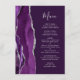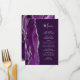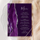 A borda esquerda deste elegante cardápio moderno de casamento apresenta uma cor d'água roxa, borda agitada com falso brilho prateado. O texto personalizável combina o script de escrita manual de cinzas prateadas e as fontes em um fundo roxo profundo. O verso apresenta um design de agata prateado e roxo correspondente.