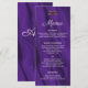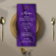 Um cardápio de na moda e roxo elegante para a recepção de casamento, com um padrão luxo e roxo de seda. Há um pequeno par de anéis de casamento de ouro no topo na frente do menu, e todos os detalhes podem ser personalizados para o fato. Na parte de trás do cartão está o mesmo design roxo, sedoso, com um par personalizado de monogramas de noiva que também podem ser personalizados para se adequarem.