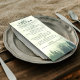 Este menu de casamento é simples, rústico e elegante. Ele apresenta um título de caligrafia com rico de serra com pano de fundo da montanha de madeira, pinheiros verdes envoltos em neblina ou neblina. A parte de trás é uma cor verde da floresta marmoreada. Perfeito para uma recepção ao ar livre.