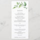 Menu de casamento russo com um simples design com uma aquarela verde pintada com folhas grandes, sobre um fundo branco. Um elegante design botânico que é excelente para um casamento de verão.
