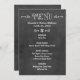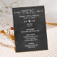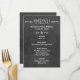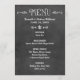 Cartão de janto de casamento casual e na moda com giz branco manuscrito na aparência do conselho preto. Personalize com informações do menu e um monograma do seu nome casado e data do casamento.