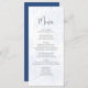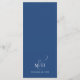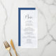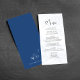 Este design apresenta um cartão de cardápio de casamento, com um roteiro elegante de caligrafia, com design floral azul clássico, com um simples curso de refeição, e um monograma e ampersand no verso.