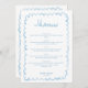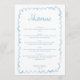 Personalizado on-line facilmente | Ilustrado à Mão | Parte de um Matching Wedding Suite Adicione um toque alegre à sua celebração de casamento com este menu de casamento caprichoso 5x7, projetado para encurtar seus convidados e amarrar sua decoração de mesa lindamente no seu tema geral. Apresentando uma encantadora estrutura de aquarela ilustrada manualmente em azul claro e um fundo branco limpo, este menu captura o espírito lúdico dos casamentos de primavera e verão, ou adiciona um toque de magia alegre a uma celebração de inverno. A design de moldura ondulada, escrita à mão, traz uma sensação artística trabalhada, enquanto a tipografia manuscrita caprichosa acrescenta calor e personalidade a cada lugar. Quer você esteja planejando um casamento romântico no jardim, uma reunião confortável no inverno, ou uma celebração animada pelo mar, este menu ajuda a definir o tom perfeito. O que torna esta design extra especial: - Estipulosamente Impressionante: Encantem seus hóspedes com uma design única que reflete a alegria e a magia de sua história de amor. - Online totalmente personalizável: edite facilmente o texto, as fontes e o layout no Zazzle, sem precisar de ferramentas de design. Torne-o verdadeiramente seu em minutos! - Três Estilos de Quadro Disponíveis: escolha entre três variações do mesmo belo design para corresponder ao resto do seu pacote de artigos de papelaria. - Parte de uma suíte de casamento coordenado: combina perfeitamente com convites, cartões RSVP, salvas as datas, convites de janto de ensaio e muito mais! Pronto para personalizar o seu menu? Comece a personalizar instantaneamente!