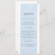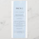 Um menu simples de recepção de aquarelas, que fornece os cursos, entradas e sobremesas disponíveis aos convidados. O design apresenta uma simples, sutil, aquarela azul-céu no fundo. A cor da fonte mostrada é preta. Estes, juntamente com o estilo da fonte, podem ser personalizados inteiramente de acordo com o seu gosto. Se precisar de outros itens correspondentes, ou se tiver perguntas, por favor, não hesite em contactar-nos.