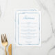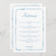 Personalizado on-line facilmente | Ilustrado à Mão | Parte de um Matching Wedding Suite Adicione um toque alegre à sua celebração de casamento com este menu de casamento caprichoso 5x7, projetado para encurtar seus convidados e amarrar sua decoração de mesa lindamente no seu tema geral. Apresentando uma encantadora e simples estrutura de aquarela, ilustrada manualmente, em azul claro e branco limpo, este menu captura o espírito lúdico dos casamentos de primavera e verão, ou adiciona um toque de magia alegre a uma celebração de inverno. A design de moldura ondulada, escrita à mão, traz uma sensação artística trabalhada, enquanto a tipografia manuscrita caprichosa acrescenta calor e personalidade a cada lugar. Quer você esteja planejando um casamento romântico no jardim, uma reunião confortável no inverno, ou uma celebração animada pelo mar, este menu ajuda a definir o tom perfeito. O que torna esta design extra especial: - Estipulosamente Impressionante: Encantem seus hóspedes com uma design única que reflete a alegria e a magia de sua história de amor. - Online totalmente personalizável: edite facilmente o texto, as fontes e o layout no Zazzle, sem precisar de ferramentas de design. Torne-o verdadeiramente seu em minutos! - Três Estilos de Quadro Disponíveis: escolha entre três variações do mesmo belo design para corresponder ao resto do seu pacote de artigos de papelaria. - Parte de uma suíte de casamento coordenado: combina perfeitamente com convites, cartões RSVP, salvas as datas, convites de janto de ensaio e muito mais! Pronto para personalizar o seu menu? Comece a personalizar instantaneamente!