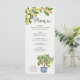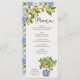 Menu de casamento de Lemon Grove com itens de menu totalmente editáveis. A design apresenta um limoeiro, azulejos mediterrânicos azuis e amarelos e um ramo de limões com flores verdes e florescentes. Perfeito para um tema de casamento de limão, o casamento inspirado em italiano, a estética da vila rustica mediterrânica, as cores de casamento azuis e amarelas ou um casamento ao ar livre em qualquer época do ano. Para coordenar convites, artigos de papelaria, dia de evento e decoração de mesas, jogos e placas de casamento, por favor, navegue na minha Coleção de Casamentos de Limão Grove ou me mande mensagens para adicionar quaisquer itens adicionais de que você precise.