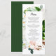 Orquídeas tropicais opulentas, magnólias, proteas rebeldes brancas e verde escura. A parte de trás do menu está verde-escuro.