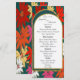 Este cardápio colorido apresenta flores multicores tropicais com dois arcos, um com cores verdes escuras e um confete de ouro e outro, branco e ouro para o texto.