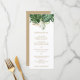 Menu de casamento botânico moderno com uma borda superior composta por verde tropical pintado com aquarela e folhas de ouro falsas. Estes elegantes menus de casamento tropicais são perfeitos para um casamento de destino de verão.