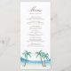 Cartões de menu Whimsical com ilustrações de aquarela de uma vista frontal com palmeiras. Personalizar por nomes e detalhes do menu. Estes cartões de cardápio tropicais são perfeitos para casamentos de praia, chás de panela e muito mais.
