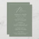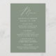 Menu de casamento simples e elegante com "Menu" exibido em um roteiro branco moderno com um fundo verde sábio ou cor de sua escolha. Personalize o menu sábio de casamento verde adicionando seus nomes, data de casamento e informações do menu. Projetado para coordenar com a nossa coleção de casamento do Modern Elegance.