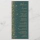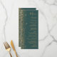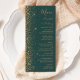 A borda esquerda deste elegante cardápio moderno de casamento apresenta um design de brilho dourado. O texto personalizável combina manuscritos dourados, copperplate e fontes itálicas em um fundo verde escuro. O verso apresenta um design brilhante verde e dourado.