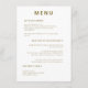 Um cartão de cardápio de casamento único com um toque moderno. Tipografia limpa contemporânea e esquema de cor verde-oliva e branca - nomes e data de casamento no verso. Use-o para sua recepção de casamento ou janto de ensaio. Todos os elementos de texto e cores podem ser personalizados para ajustado de sua necessidade e tema do casamento.