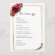 Um elegante cardápio vermelho-rosa-burgundy e cardápio de ouro com lindas flores e folhas verdes. Uma fusão encantadora de elegância e encanto romântico. Estes belos convites estão em tons rosas e vermelhos ricos. A caligrafia é elegante e chique e pode ser facilmente personalizada. Convites românticos e modernos de casamento floral com cores clássicas que nunca saem do estilo.
