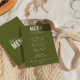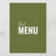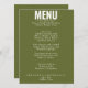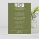 Um retro fedorento, moderno e brilhante menu de janto de casamento. Que apresenta modelo de chic de boho vintage fundo verde azeitona e tipografia branca e menu em negrito de branco. Perfeito e compatível com toda a suíte.
