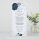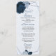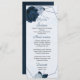 belas flores azuis e marinhos azuis e elegantes cardápios geométricos de casamento. Volta do cartão: lírios azuis elegantes e poeirentos num fundo azul marinho Os detalhes da brilha são simulados